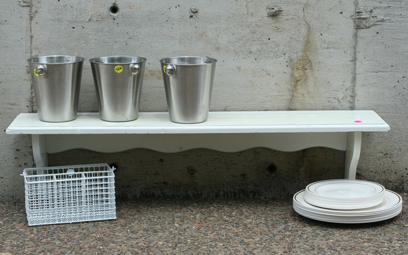 The 3 silver buckets actually look like wine buckets. They were 50¢ each. Yay! They have those little knobby handles on both sides, but I’m going to turn them so that one knob faces forward, then tie a tag on them and put them on the shelf to hold supplies. I’m super excited about this, too!