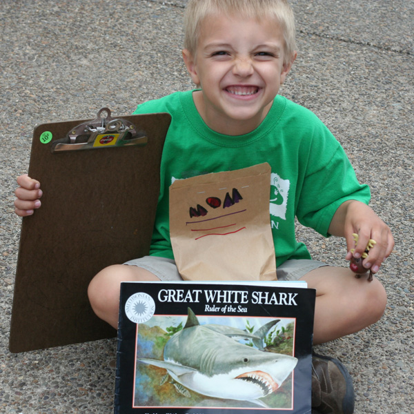 I actually bought the book for him for 25¢ (he loves sharks), but he bought the rest and has money left over. The clipboard was 10¢, there is an adorable little bud vase that he bought for me for my birthday in the bag, and he got the moose that poops jelly beans (or m&ms in this family) for free. Ah, yes. Every little boy needs a moose that poops. He is so proud of himself! And, I’m excited to get that bud vase. This boy loves to pick me flowers.