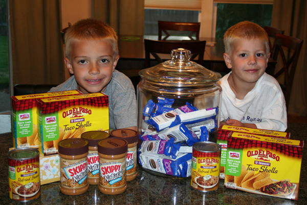 SO, on my first transaction, I purchased 6 boxes of 100 Calorie Snacks (which I dumped into the big “lunch treat” jar for Grant’s school lunches - he gets to pick one a day). I also purchased 2 boxes of taco shells and a can of refried beans. (All the stuff on the right side of the photo next to Cole.) The taco shells and beans cost me 28¢ TOTAL. The 6 boxes of 100 Calories Snacks cost me $6.71 (and that was AFTER coupons, people! Such a rip off!). HOWEVER, I used my Catalinas to bring that total down to $1.93 Out of Pocket. And, I earned a $3.00 Catalina!