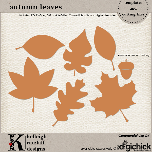 Autumn Leaves by Kelleigh Ratzlaff Designs: A set of autumn leaves plus an adorable acorn that you can dress up with digital paper, cut out of traditional paper, or add to your digital layout! $3.99