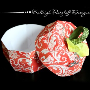 Tip #6 - You may notice that right near the slit, the tab is a bit different and there is a notch. When creating the apple, I poked the middle of the lid down and then closed the slot entirely by adhering the top tab to the inside (which pulls the lid a little tight), while leaving the bottom tab a bit loose (not pulled tight into place). With the pumpkin, though, I did just the opposite. I left the top tab a little loose (so, yes, you can see the notch) and tightened up the bottom tab so that it matches up perfectly with the opposite edge. You can play with these tabs and adjust them to fit your project.