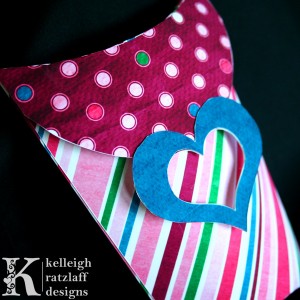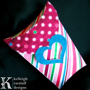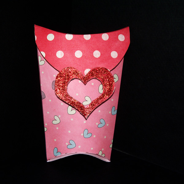 I added a flap to my tapered pillow box with a fun heart cut out detail. I included an additional heart shape to add to the front of your finished project to give it a little more dimension (as if a pillow box needs more dimension!).