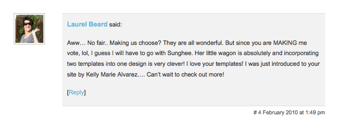 Congratulations to Sunghee, this week’s Blog Hop super star! I’ll be sending Sunghee $10 in PayPal money so she can go pick up some new stuff to use with my templates (or whatever you want, Sunghee. I don’t care! LOL!).
