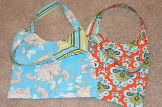 This morning I said goodbye to my parents and two youngest sisters who had been visiting us this week from California. They were only here for a few days, but we made the most of them and had a wonderful time. My sisters (ages 9.95 and 10) did a marvelous job of occupying my sons while my mom and I sewed. Check out our fabric concoctions. Yes, they are the same Amy Butler Swing Bag pattern that I posted about below.