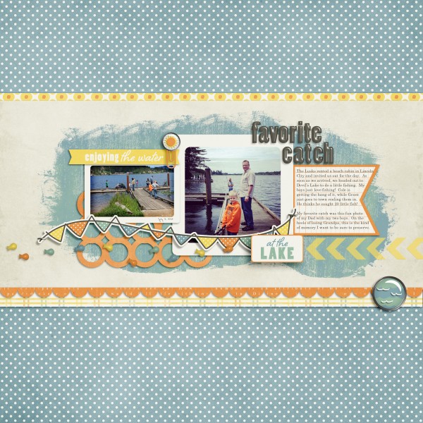 My sister’s family rented a beach house and invited us to join them earlier this week. We took a little trip to a nearby lake where the kids all went fishing. I created this layout to showcase my favorite catch of the day: the photo of my dad on the dock with my boys. I love the vintage look to the photo and the fact that it showcases three very important people in my life.