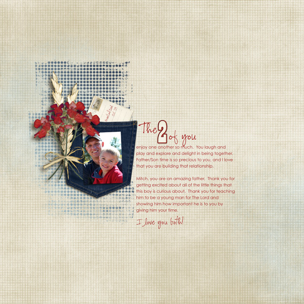I used the same paper for this one! How unoriginal, but it still looks cool! From ViVa Artistry: Nature Papers, Botanicals Mask, word art by Roben-Marie, elements from the DST Gold Member kit by Kelley Mickus (how funny that I used all of the same designers for this second layout!) and Jumpers (layered templates) by Crystal Livesay (I just love all of her templates!).