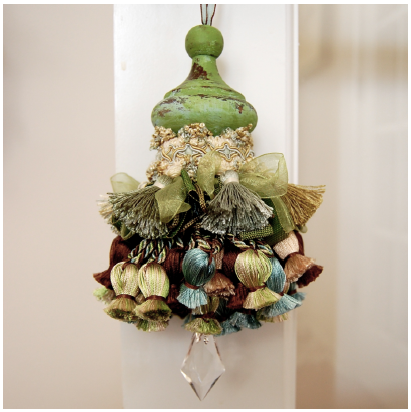 And so, I grabbed my glue gun and my new fringe. I dug through my scrapbooking supplies for some fun ribbon. I made my husband get the Christmas ornaments down from the attic . . . and I began my first tassel. After only two hot glue burns, I came up with this: