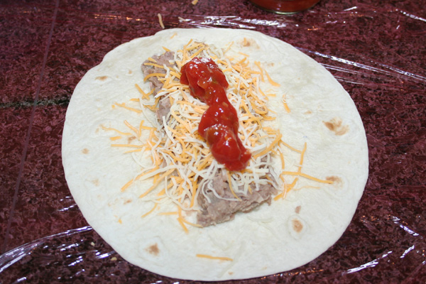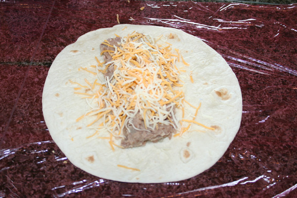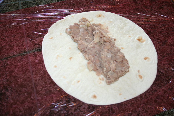Spread some beans out onto a flour tortilla. (pre-made)