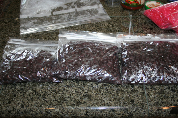 The 1lb bag of black beans (which we go through like MAD at our house) yielded 5 cups of prepared beans. I put them in 2 c. portions (except for the 1 leftover cup) in regular sandwich bags.