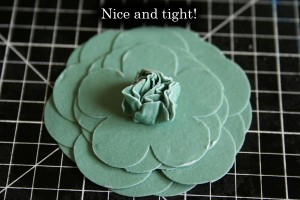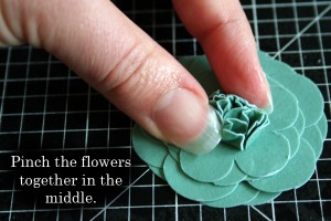 Now the scrunching begins! Start in the middle with the smallest flower and scrunch it up close to the brad as shown. Pinch, pinch, pinch!