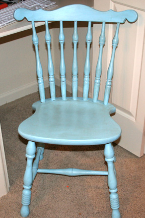 I cleaned it up a little and sanded the picture part where it was coming up a little, then I primed it with one coat of stain blocking primer. I painted the frame with two coats of my free quart of Robin’s Egg Blue Glidden paint (they were giving it away in an online promotion a couple of months ago!). And, while I was at it, I painted the chair from my digital work station (which was also a dollar at a garage sale, by the way!). I will NEVER paint a chair with a paint brush again. Ack. It was a major pain. But, it’s done. And Robin’s Egg Blue, so . . .