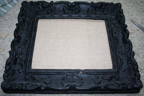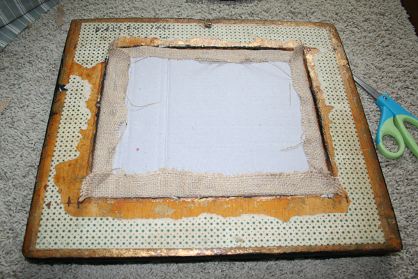 Then, I ran a bead of hot glue around the inside of the frame and shoved the burlap-covered-cardboard into place. It’s not pretty on the back, but it works!!