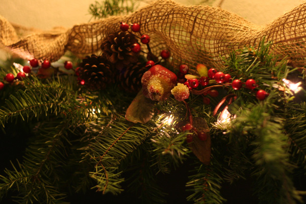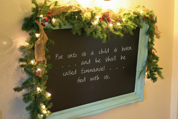 Now, if we move on into the “hall”/entryway, you can see what I’ve done with the “ugly picture turned chalkboard” garage sale find. I know I need more of that burlap netting stuff, but you get the picture! IT DOESN’T HAVE TO BE PERFECT TO BE BEAUTIFUL, people! I took some lit garland that we picked up on Target clearance last year for about $2, and draped it over the frame, then shoved some of my tree branches into it. The rest of the berries, etc. are from old wreaths from years past. I always take out the good stuff before throwing the withered wreath away.
