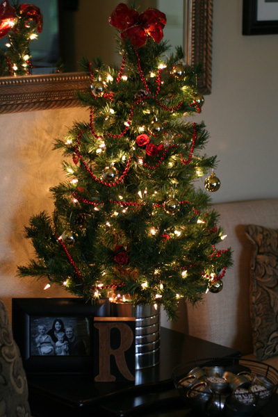 The family room, the room that actually has furniture in it, is where we usually hang out. This year, I picked up a little fake Christmas tree at a garage sale ($2), plopped it in a coffee can filled with rocks, and placed it on our little nesting tables. It is decorated with little gold balls, roses, and red bead garland picked up from the dollar store. Really, it is nothing fancy, but it does bring a festive touch into the room. Can you see the advent calendar bowl? The boys have enjoyed it so much!! Remember, it’s not too late to do an advent calendar for your kids. They won’t mind if it only lasts one week! (You can check out my tutorial here.)