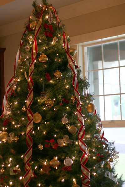 Poinsettas that I picked up in a bunch at Walmart and glittered about 11 years ago, and some gold ribbon bows that my roommate and I tied up for Mitch and his roommate back when we were in college. Yep, we decorated Mitch’s bachelor tree with these little gold bows! And, just last year we finally got rid of the cracked gold balls from his college days and replaced them with some new after-Christmas specials. I DID splurge on a tub of unbreakable gold balls this year.