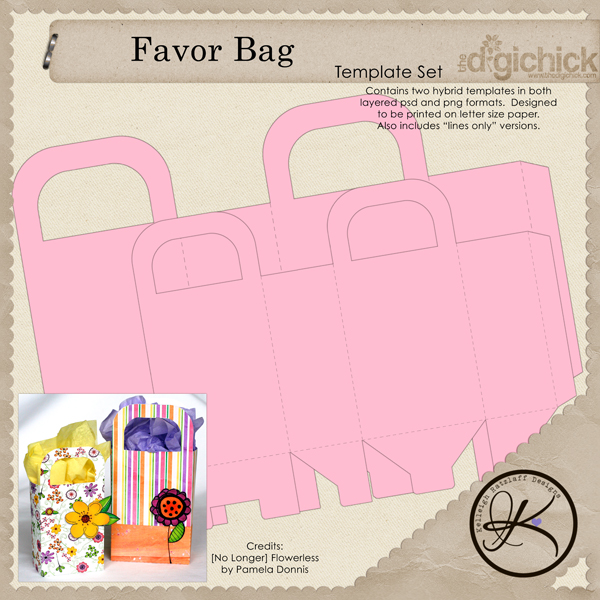 Go grab the Favor Bag Template Set. This is SUCH a great template. I use it all the time! Perfect for birthday party favor bags, or use the little one as a shower or wedding favor container! Really cute!