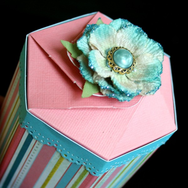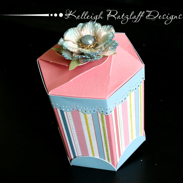 So pretty!! I used my Martha Stewart doily punch to add some decoration to the top edge of the box and stuck a pretty Prima flower on top!