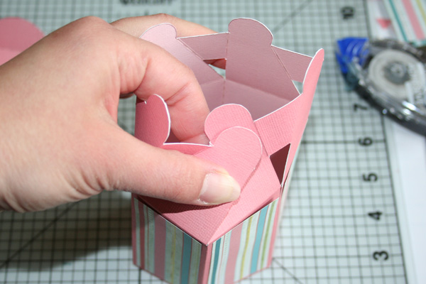 Make sure you have folded on the scored lines of the lid VERY well. Bend them back and forth so they are pretty flexible. Now, match up the tops as shown in the picture, all the way around the box, making sure you are going in the same direction the whole time. The very last fold might be stubborn, but all you have to do is tuck the paper strip that is holding the top together IN (just like all the rest) and match up the tabs. Force it. You got that?