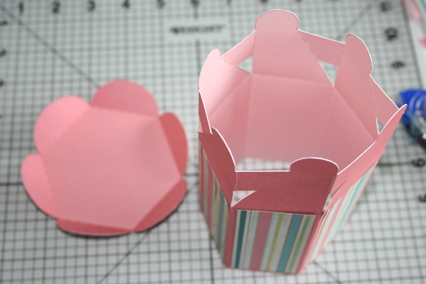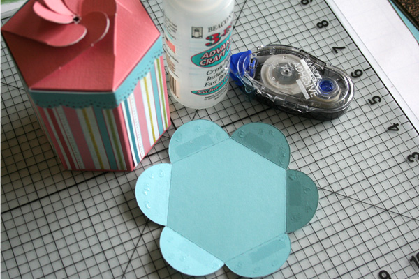 It was at this point that I realized that my project needed a little bit of blue, so I printed the bottom onto blue cardstock. I scored, cut and folded. Then, I applied some glue (wet and dry) to the petals and glued the bottom onto the box.