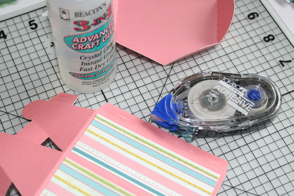 Now, flip the template back over and add adhesive to the side flap to glue the whole thing in a round. I used both Tombow Mono Adhesive (tape runner) to get an immediate bond, and Beacon’s 3-in-1 glue for a more permanent bond.